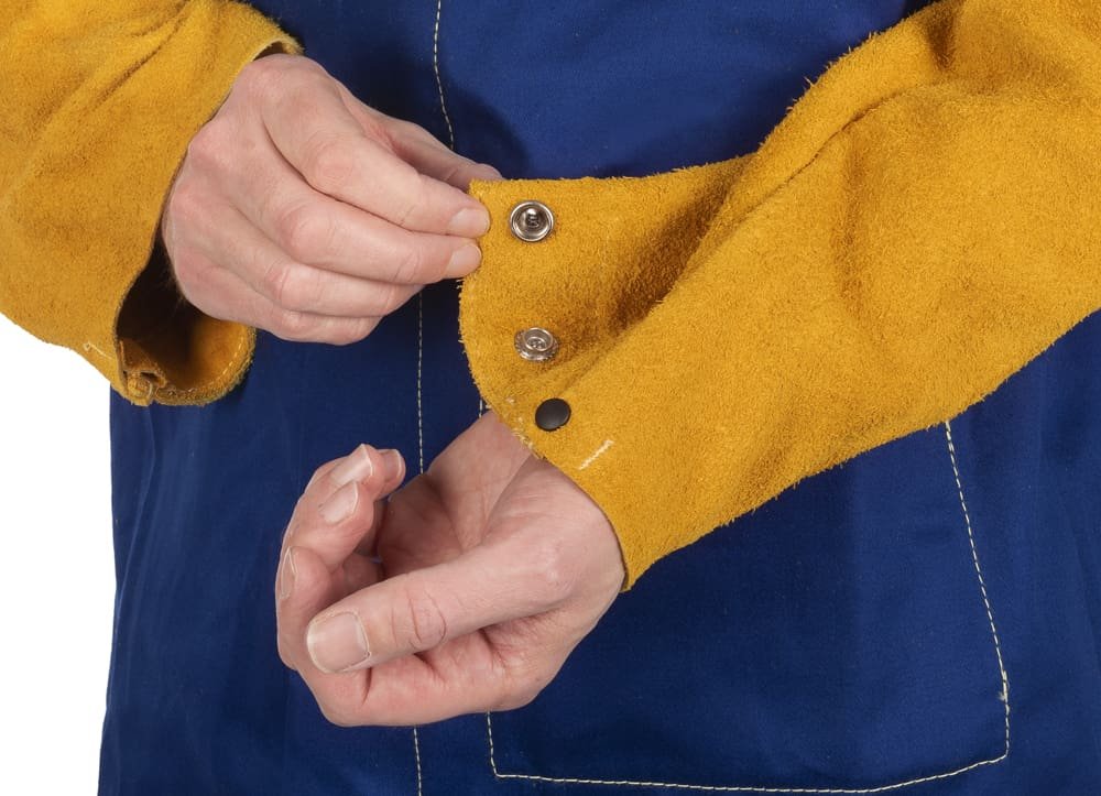 Giacchetta Yellowjacket® blu cotone ignifugo con maniche pelle crosta bovina giallo